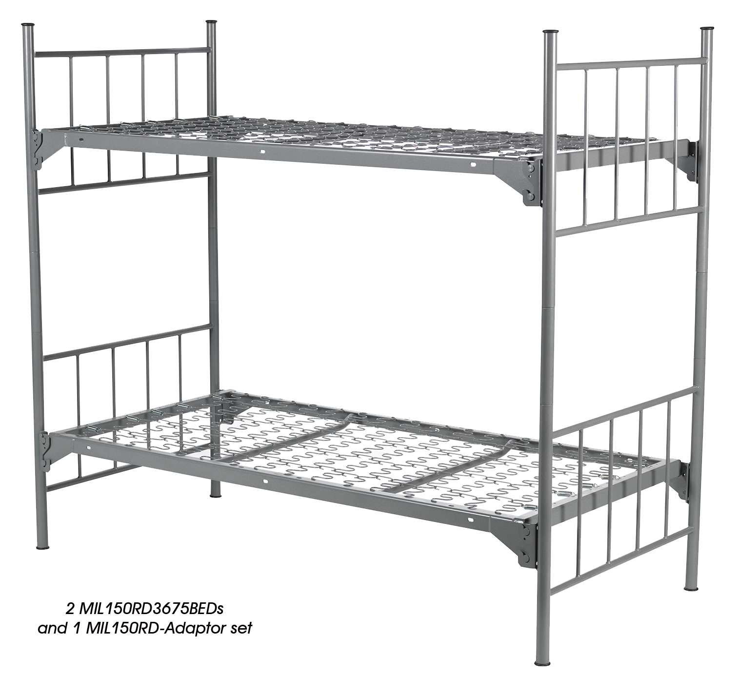 This Set of 4 Bunkbed Adaptors converts 2 military beds into a bunk bed with round tubes. Works only with MIL150RD beds.