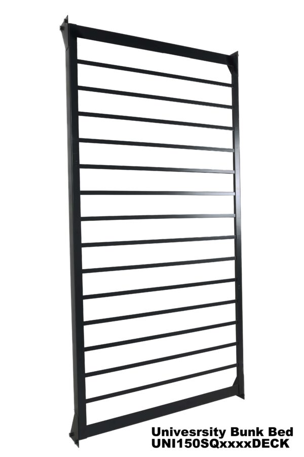 This University Bunk Bed with Built in Ladder and 2 Guardrails has 1-1/2″ square posts, 1″ and 1/2″ square tubes. The button and hook in style connector between the decks and the headboards makes for a solid connection. The epoxy powder coating makes it rust resistant. The built-in ladder and guardrails ensure that it meets the ASTM F 1427-13 Standard Consumer Safety Specifications for Bunk Beds and meets the Code of Federal Regulations 1213 Safety Standard for Entrapment Hazard in Bunk Beds, and the Code of Federal Regulations 1513 Requirements for Bunk Beds.